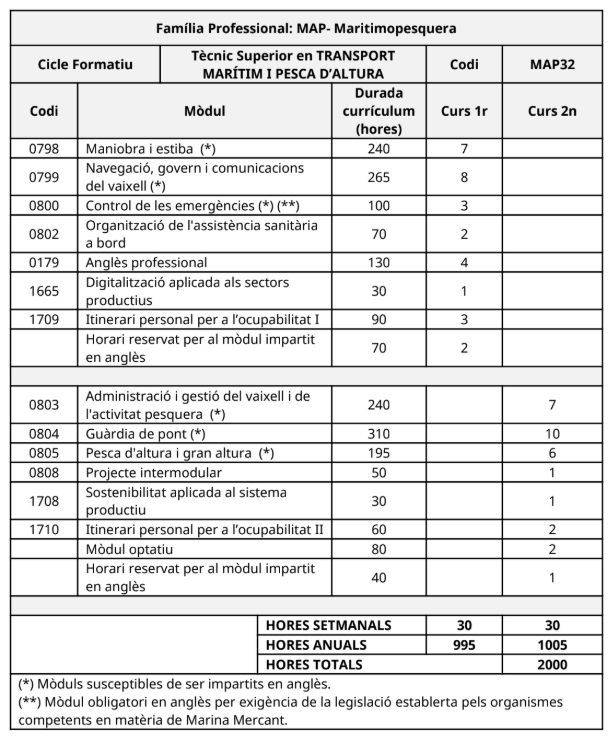 El cicle de Transport Marítim i Pesca d’Altura té una durada de 2000 hores, de les quals 500 hores són de formació en centres de treball, repartides en els dos cursos acadèmics.