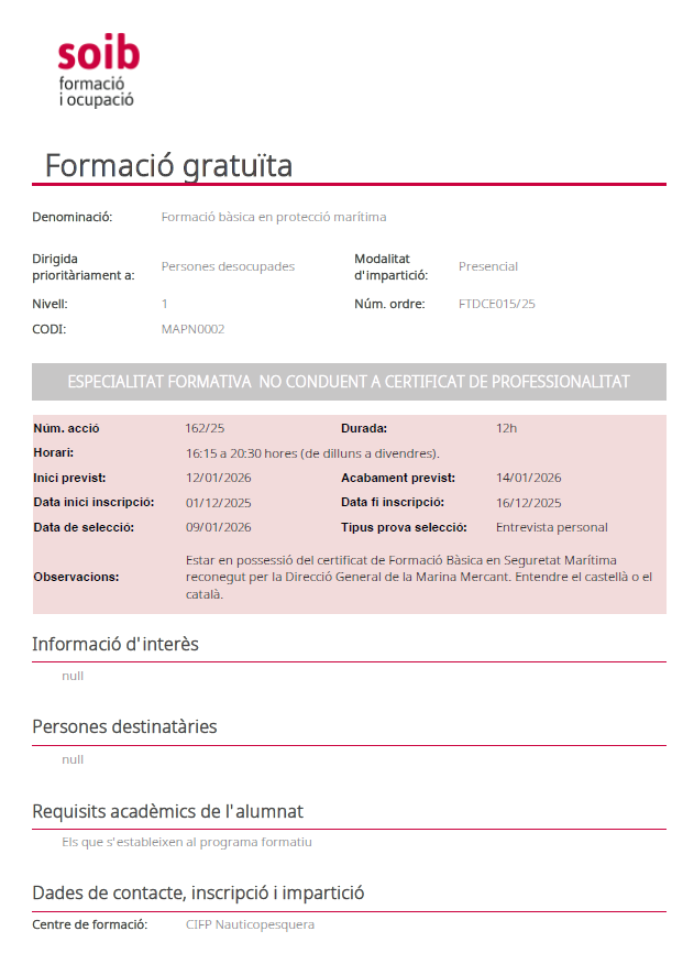 • Observacions: El curs és presencial i només es permet la falta d’assistència al 10% del total d’hores lectives teòriques. Pel que fa a la part pràctica, aquesta s’ha de completar amb la seva totalitat.