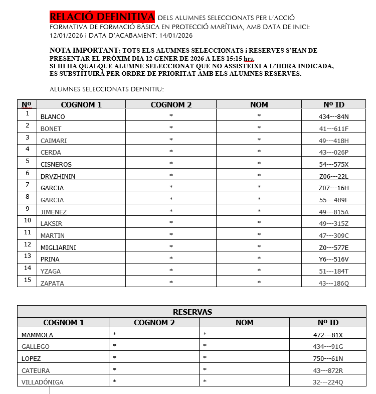 Llistat DEFINITU d’admesos al cursos de FB en Protecció i de Mariner de Pont, amb inici 12 GENERPor CIFPNauticopesquera / 12/01/2026