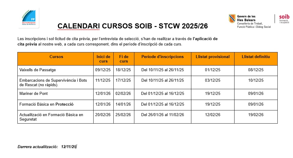 S’ha publicat el primer calendari de cursos que oferim subvencionats pel SOIB. Les inscripcions i sol·licitud de cita prèvia, per l’entrevista de selecció, s’han de realitzar a través de l’aplicació de cita prèvia al nostre web, a cada curs corresponent, dins el període d’inscripció de cada curs.