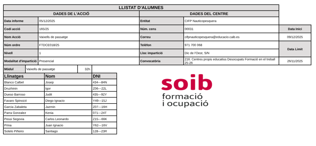 LLISTA DEFINITIVA DE PERSONES ADMESES AL CURS: Tots els admesos han de presentar-se al CIFP Nauticopesquera el dimarts 09 de desembre a les 15:15 per començar el curs.